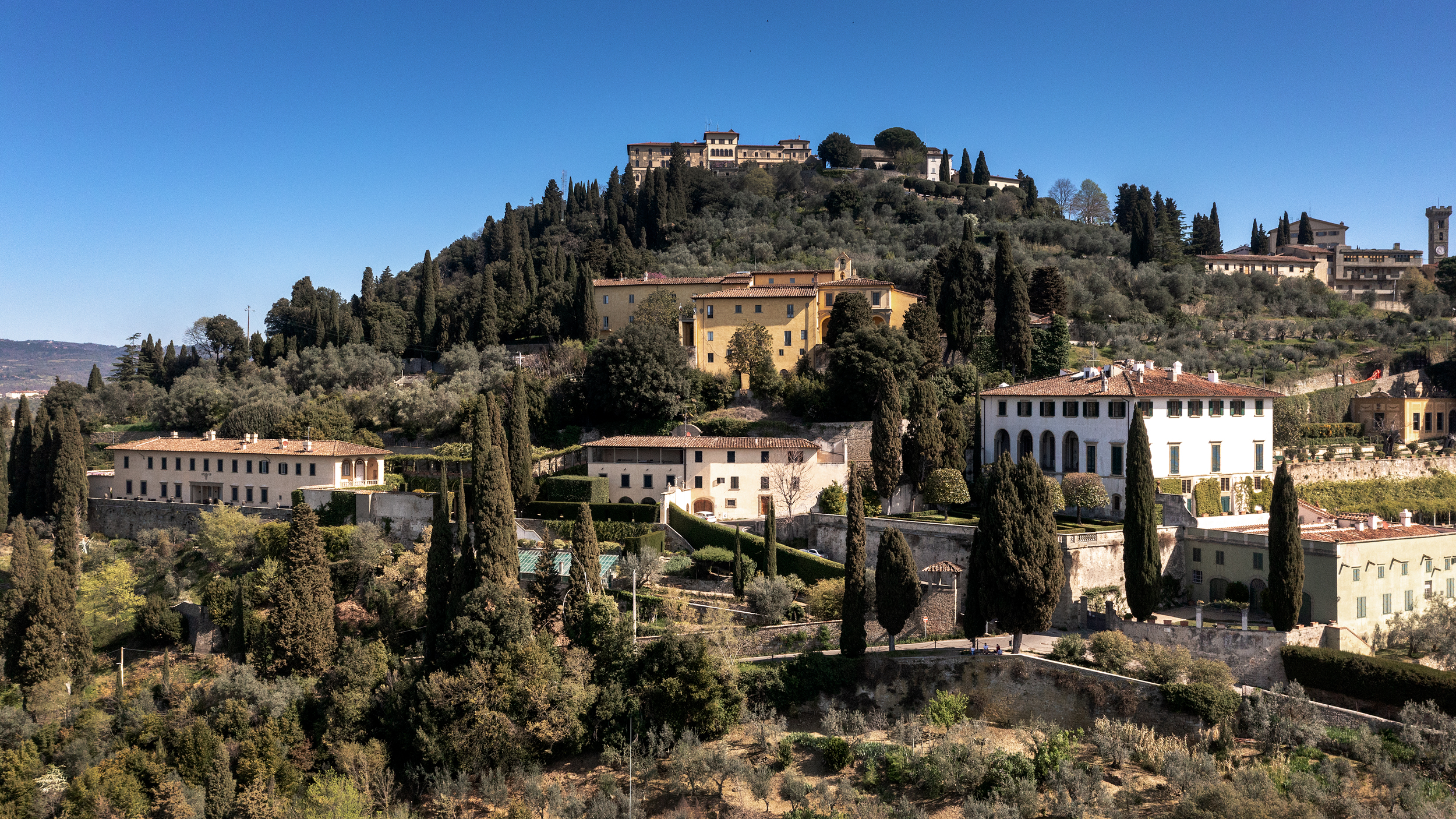 Preceduta da un ampio prato circondato da filari di antichi cipressi che si diramano in un lungo viale sulla sommità della collina, la facciata principale dell’imponente villa, con il suo monumentale portale balconato che richiama l’architettura seicentesca, si erge sul pianoro dominando il severo e suggestivo paesaggio del Mugello. Sul lato orientale si trova l’elegante cappella dedicata alla Madonna della Neve, in relazione con lo spazio privato all’inglese, delimitato da file di cipressi.