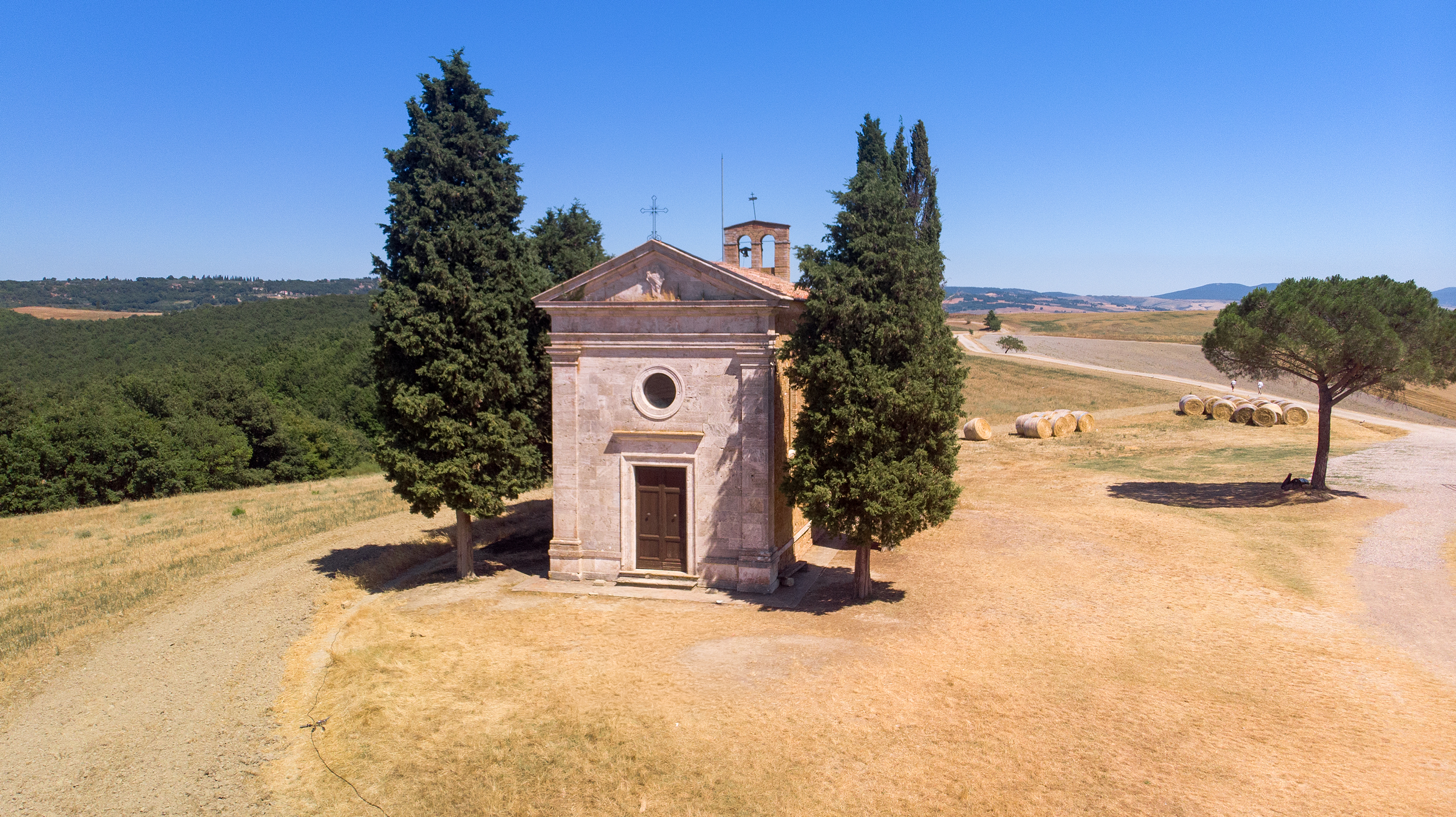 La cappella, di probabile origine tardo-rinascimentale, è ricordata per la prima volta in un documento del 1590. L’edificio, danneggiato da un terremoto, venne riprogettato sia esternamente che internamente dall’architetto Giuseppe Partini nel 1884, ispirandosi a modelli cinquecenteschi. A partire dal mesi di marzo 2021 è stata soggetta ad un imponente lavoro di restauro insieme al podere antistante, finanziato dal proprietario, il quale ha portato la piccola cappella alle sembianze originali del 1884. Il restauro si è concluso il 18 luglio dello stesso anno con la benedizione dell’altare da parte dell’arcivescovo di Siena cardinale Lojudice. La cappella si trova su una strada sterrata che porta da Pienza a San Quirico d’Orcia ed è posta sotto tutela dall’UNESCO. L’edificio religioso si presenta ad aula unica, con la facciata principale rivestita in pietra di Rapolano che si caratterizza per un piccolo rosone che si apre al di sopra del portale architravato; lateralmente, la stessa facciata è delimitata da lesene, una a destra e l’altra a sinistra, sulle quali poggia il frontone sommitale, nel cui timpano è collocato uno stemma gentilizio.